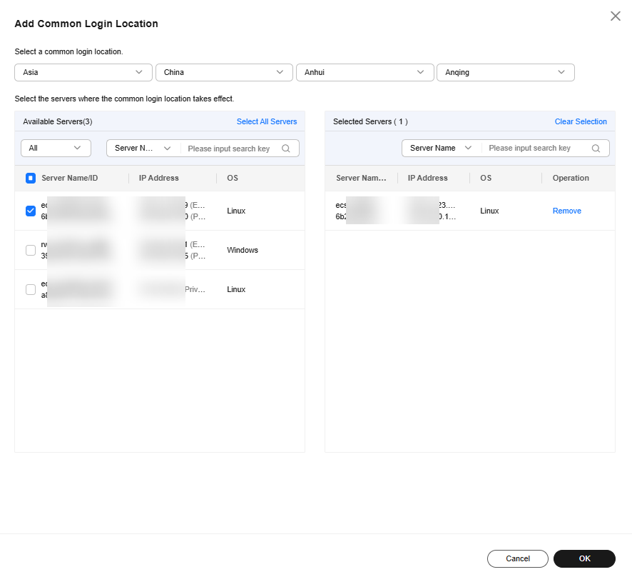 - In the dialog box, select the common login location to be added and the server where the common login location takes effect. After confirming that the information is correct, click OK.