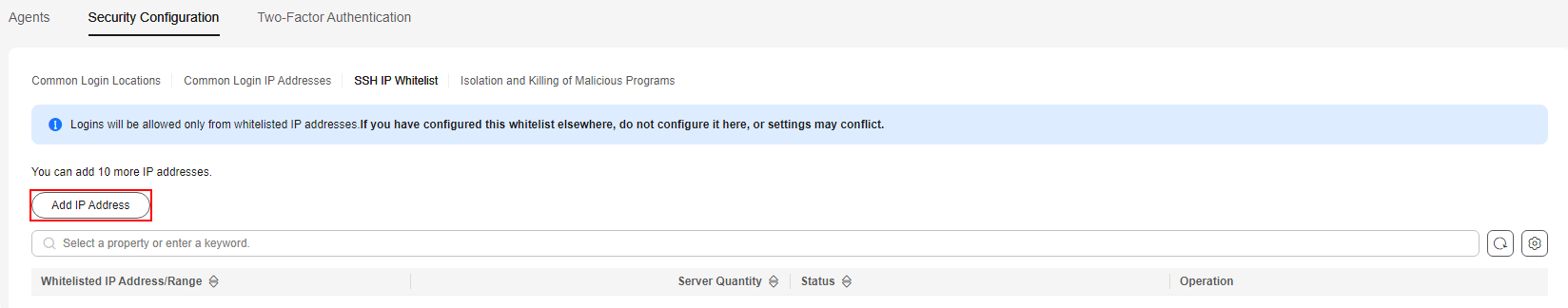 - Click the Security Configuration tab page and click SSH IP Whitelist.