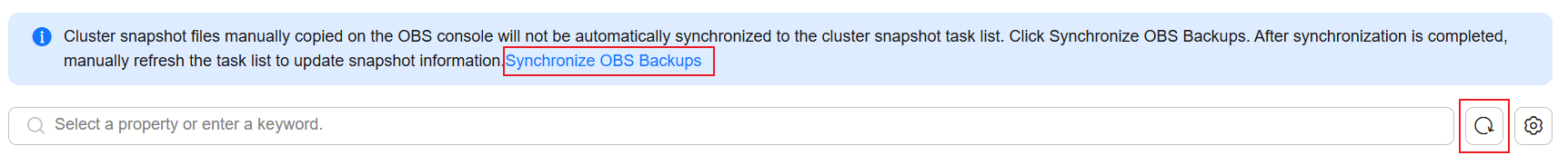 - Above the cluster snapshot task list, click Synchronize OBS Backups. After data synchronization, manually refresh the list to show the updated snapshot information.