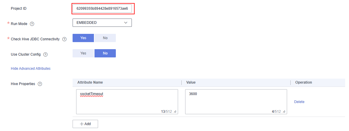 - When creating a Hive data connection: If you want to interconnect Hive with LakeFormation, select Yes for OBS storage support and set the OBS AK/SK. Retain the same settings for other parameters as those if you do not want to interconnect Hive with LakeFormation.