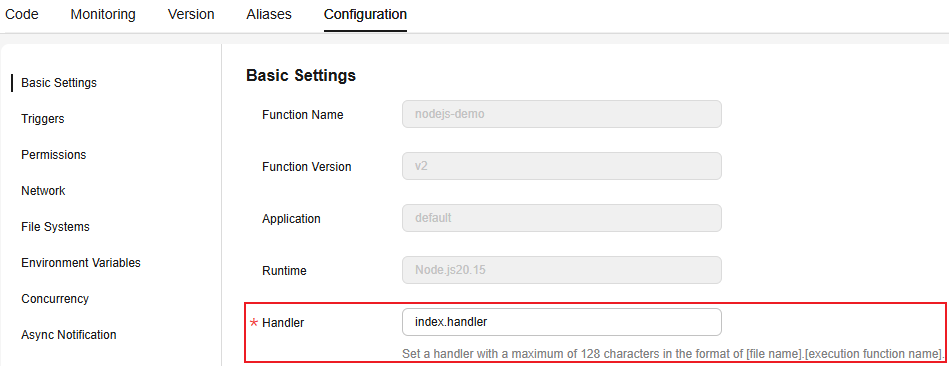 - The handler is a function name, which must be consistent with that defined in the index.js file in Step 1: Creating a Node.js Function Project.
