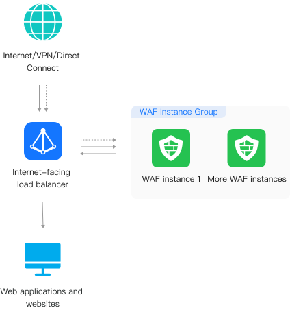The website traffic is distributed to your WAF instances over load balancers and then sent to your origin servers. Scalable: You can purchase multiple WAF instances to improve the overall performance of the instance group. Better fault recovery capability: If your WAF instance becomes faulty, your website traffic is directly sent to your origin servers through ELB without affecting your workloads. In this mode, WAF protects web applications on the cloud only.
