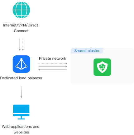 You can easily deploy WAF within several minutes. WAF protects only web applications and websites on the cloud.