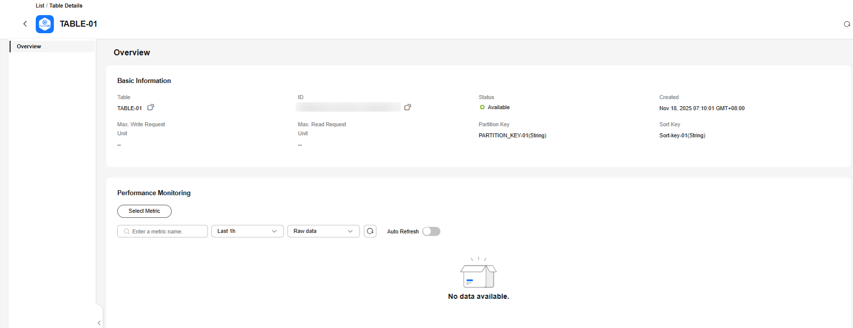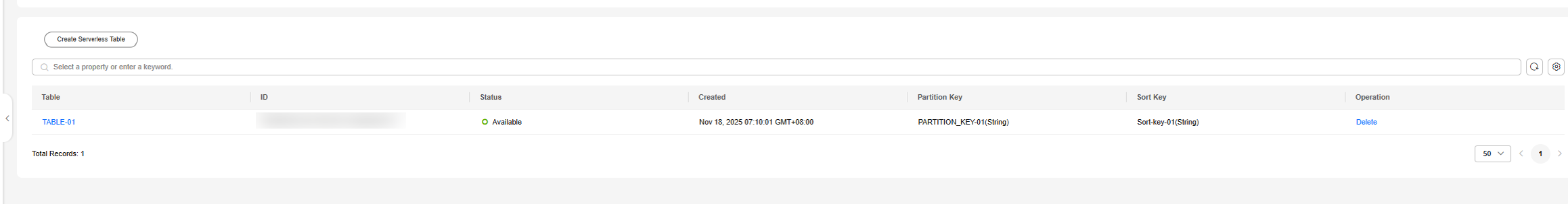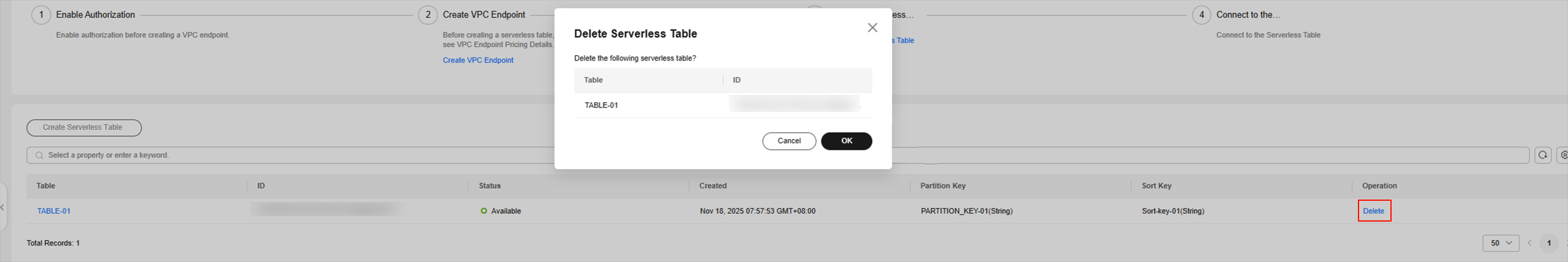 After a VPC endpoint is created, you can create, delete, and view GeminiDB Serverless tables on the console.
