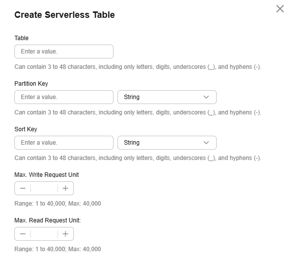 (Mandatory) Partition key name, which can contain 3 to 48 characters, including only letters, digits, underscores (_), and hyphens (-)