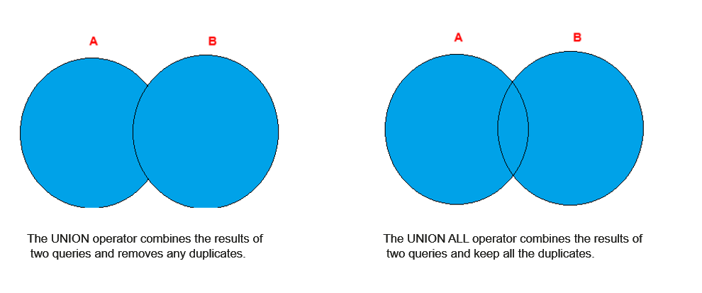 UNION is a powerful SQL operator that combines the result sets of two or more SELECT statements into one. During combination, the number of columns and data types in the two tables must be the same and correspond to each other. Use the UNION or UNION ALL keyword between SELECT statements.