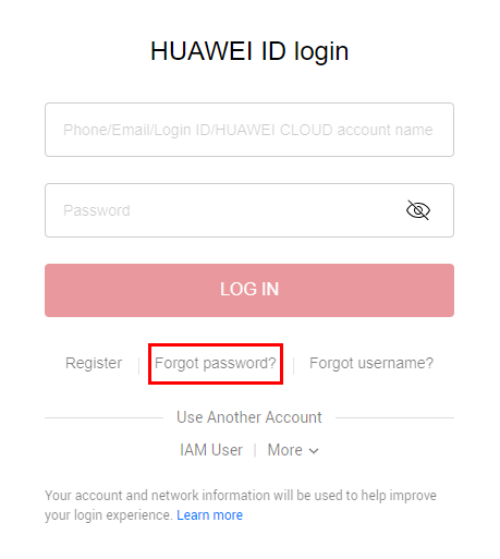1. On the HUAWEI ID login page, click IAM User. On the displayed login page, click Forgot Password.