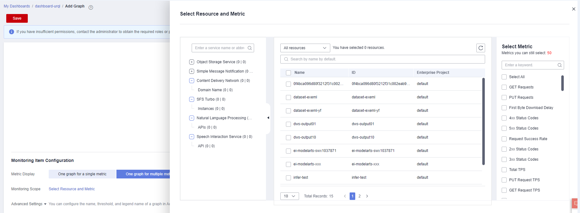 - In the navigation pane of the Cloud Eye management console, choose Dashboards > My Dashboards. Click the name of the dashboard for which you want to add a graph. On the My Dashboards page that is displayed, click Add Graph.