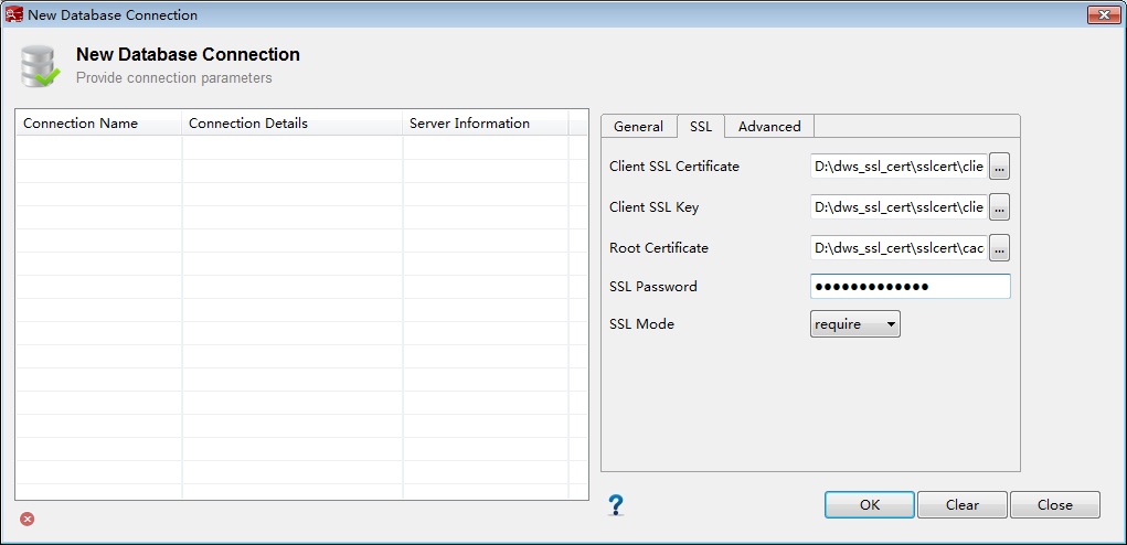 Figure 3 Configuring SSL parameters - Click OK to establish the database connection.