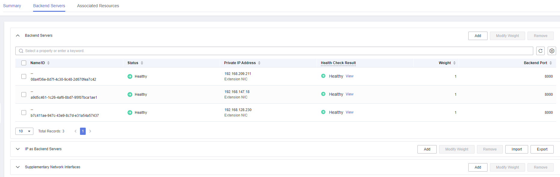 • When you associate ELB, the ROUND_ROBIN policy is set by default. In addition, the health check interval is set to 10 seconds, the timeout duration is set to 50 seconds, and the number of maximum retries is set to 3. Exercise caution when you modify these ELB parameters.