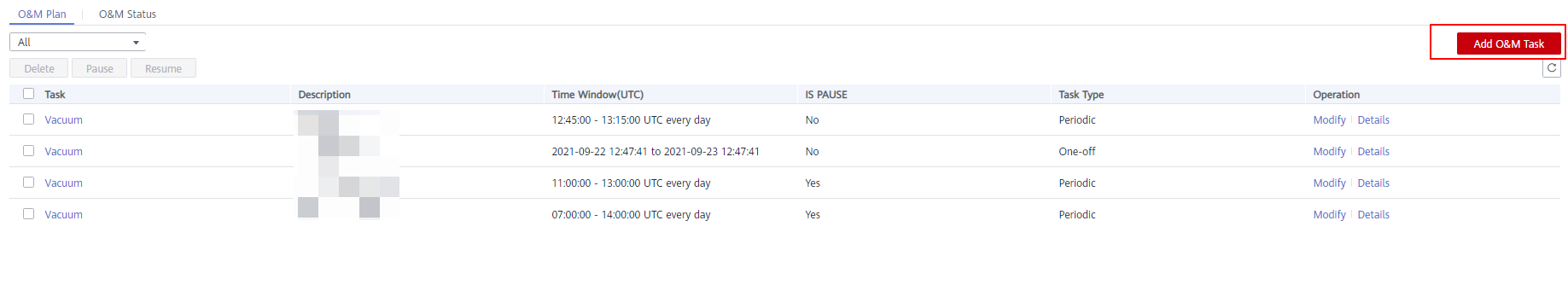 For automatic Vacuum O&M tasks, the system uses the VACUUM FULL operation to process user tables. VACUUM FULL holds a level 8 lock, which blocks other transactions. Other transactions will be in lock waiting during VACUUM FULL execution. After 20 minutes, a timeout error is reported. Therefore, do not perform other transactions in the configured time window.