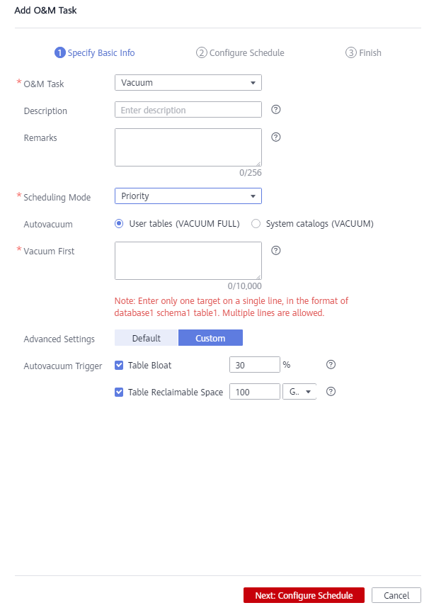 • Set Scheduling Mode to Auto. DWS automatically scans tables that require VACUUM operation.