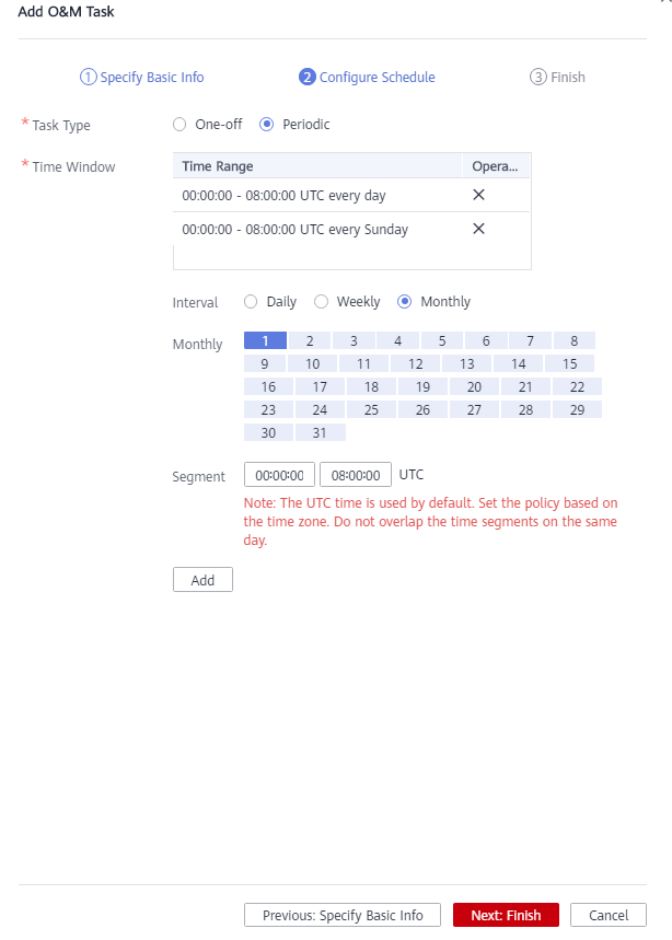 6. Click Next: Configure Schedule to configure the schedule and Vacuum type. You are advised to select Periodic for Task Type. The DWS automatically executes VACUUM in your selected time windows.