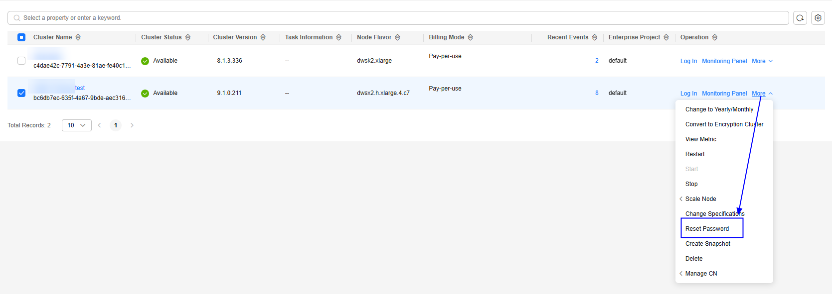 - To change the password of user dbadmin, log in to the DWS console, locate the target cluster and choose More > Reset Password in the Operation column.