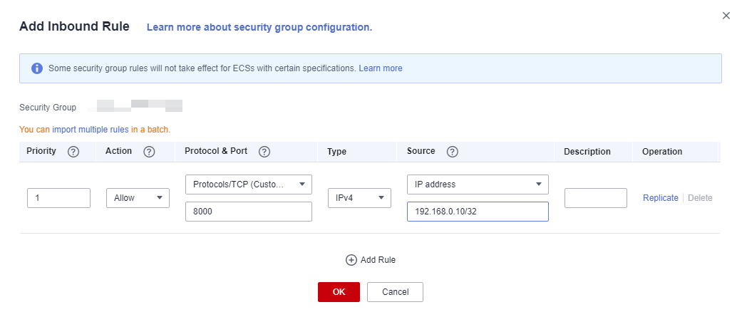 • Source: Select IP address and use the host IP address of the client host, for example, 192.168.0.10/32.