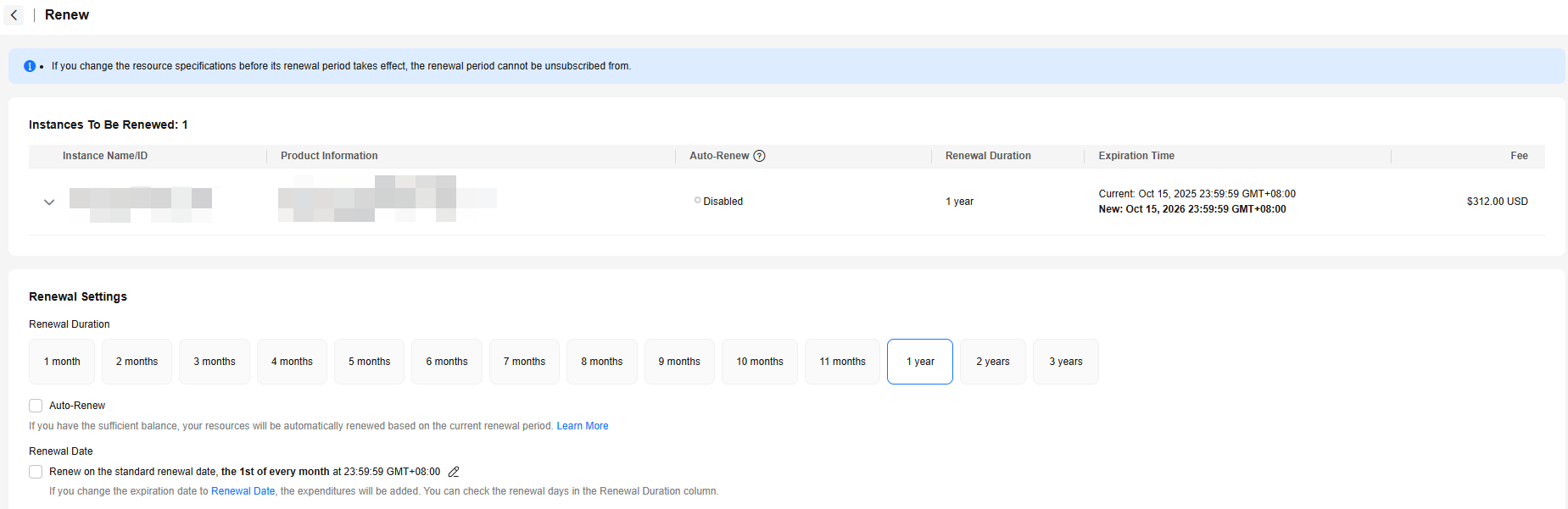 - Select the discount package order to be renewed and click Renew above the list. The renewal page is displayed.