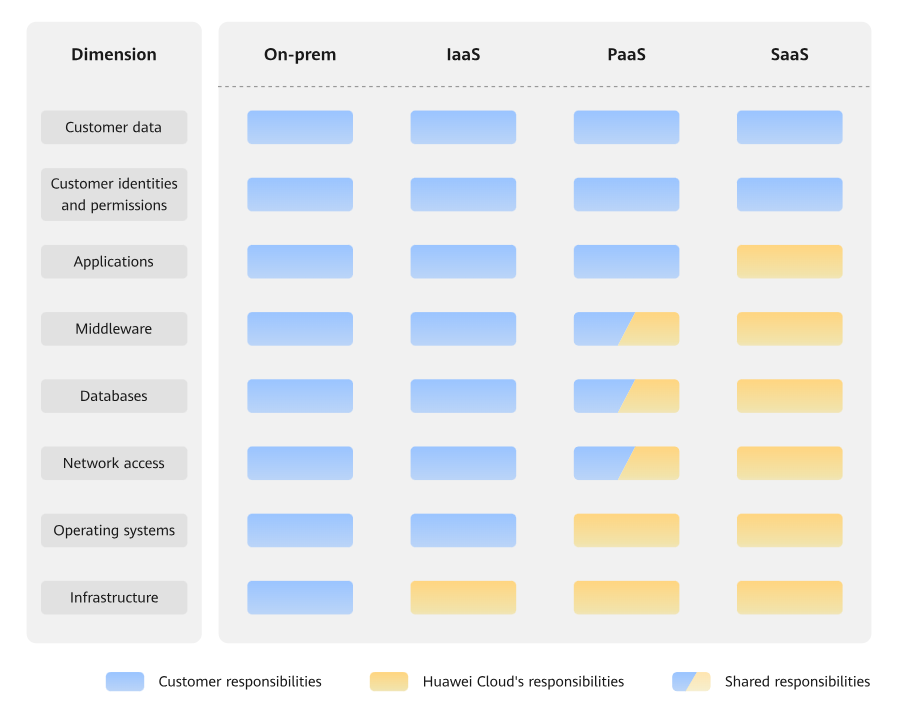 - Huawei Cloud: Huawei Cloud is responsible for infrastructure security, including security and compliance, regardless of cloud service categories. The infrastructure consists of physical data centers, which house compute, storage, and network resources, virtualization platforms, and cloud services Huawei Cloud provides for you. In PaaS and SaaS scenarios, Huawei Cloud is responsible for security settings, vulnerability remediation, security controls, and detecting any intrusions into the network where your services or Huawei Cloud components are deployed.