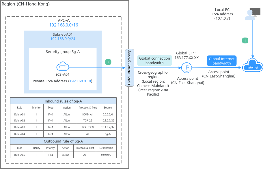 1. The local PC (IP address: 10.1.0.7) can remotely log in to ECS-A01 across regions.