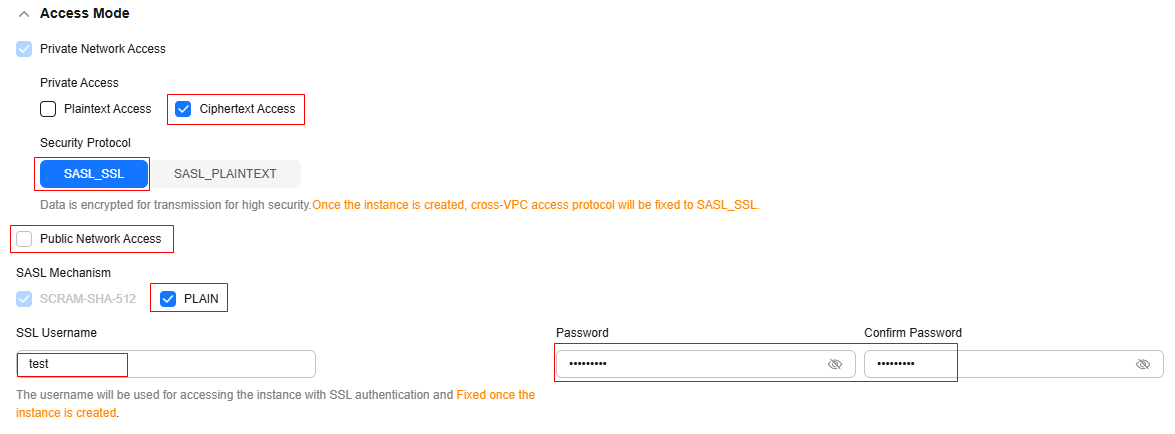 You can select the specification and quantity, and enable ciphertext access and SASL_SSL when creating a Kafka instance.