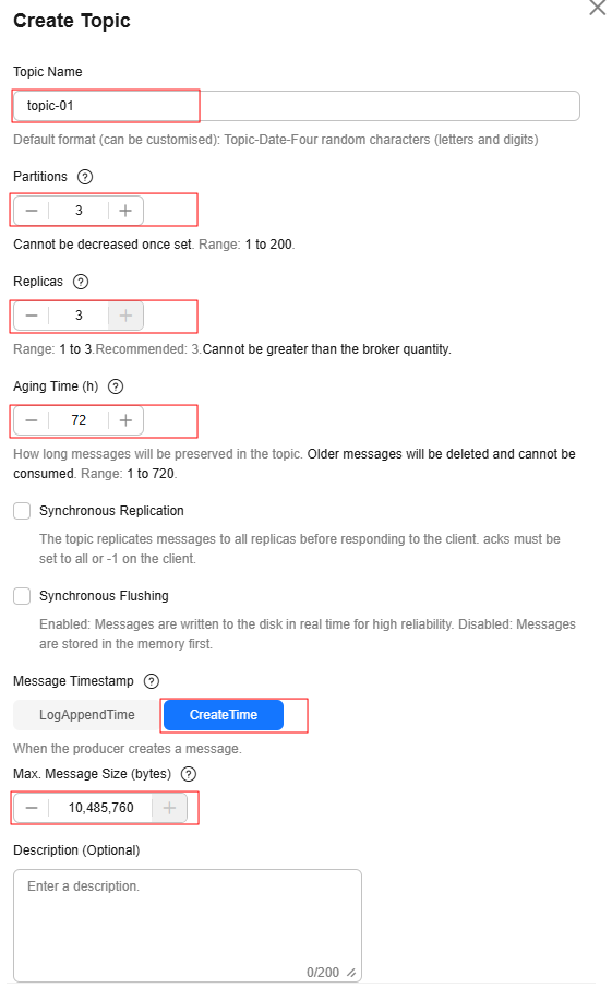 - Enter the topic name, specify other parameters by referring to Table 7, and click OK.
