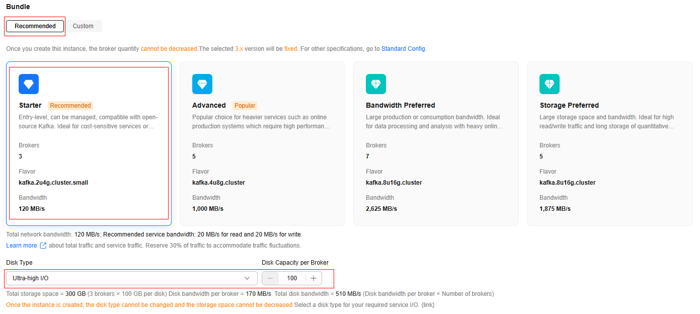 Choose Recommended > Starter. This entry level can be managed, compatible with open-source Kafka. Ideal for cost-sensitive services or test environments that are tolerant to limited performance and latency.