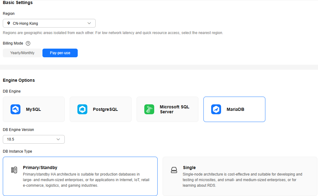 - Single: A single-node architecture is less expensive than a primary/standby DB pair. It is only recommended for development and testing of microsites, and small and medium enterprises, or for learning about RDS.
