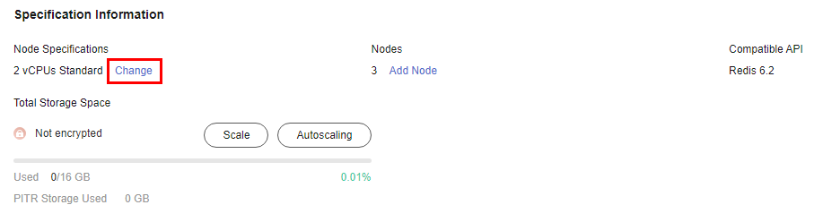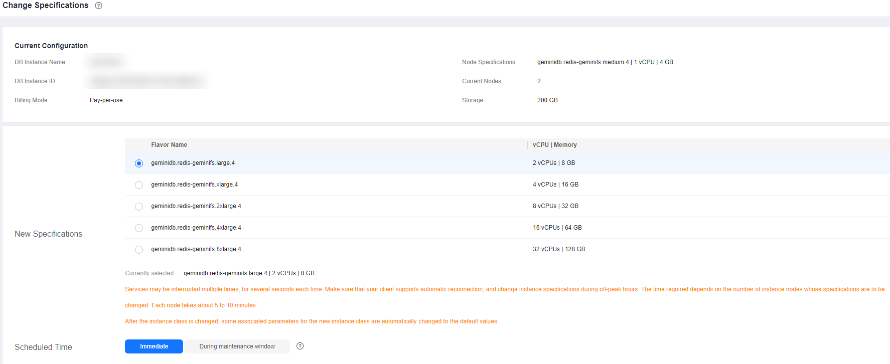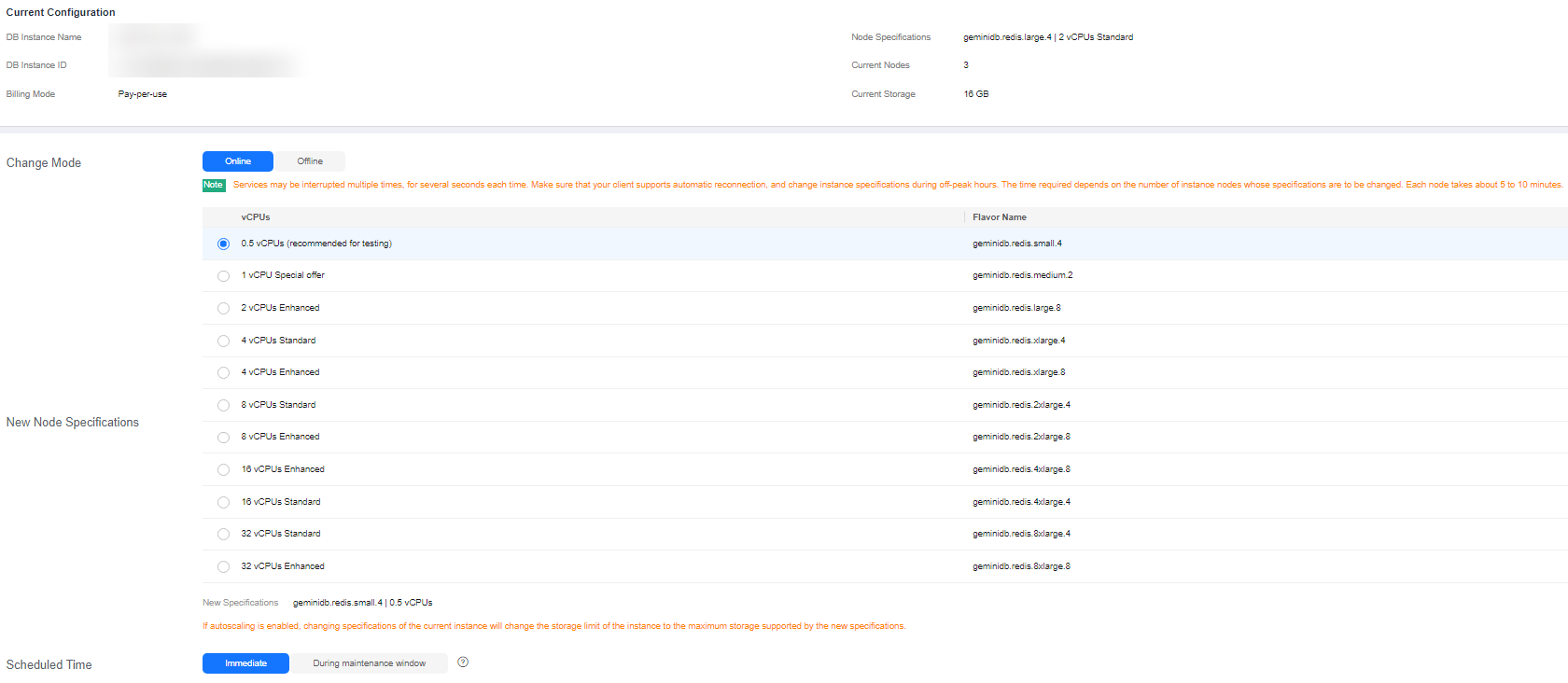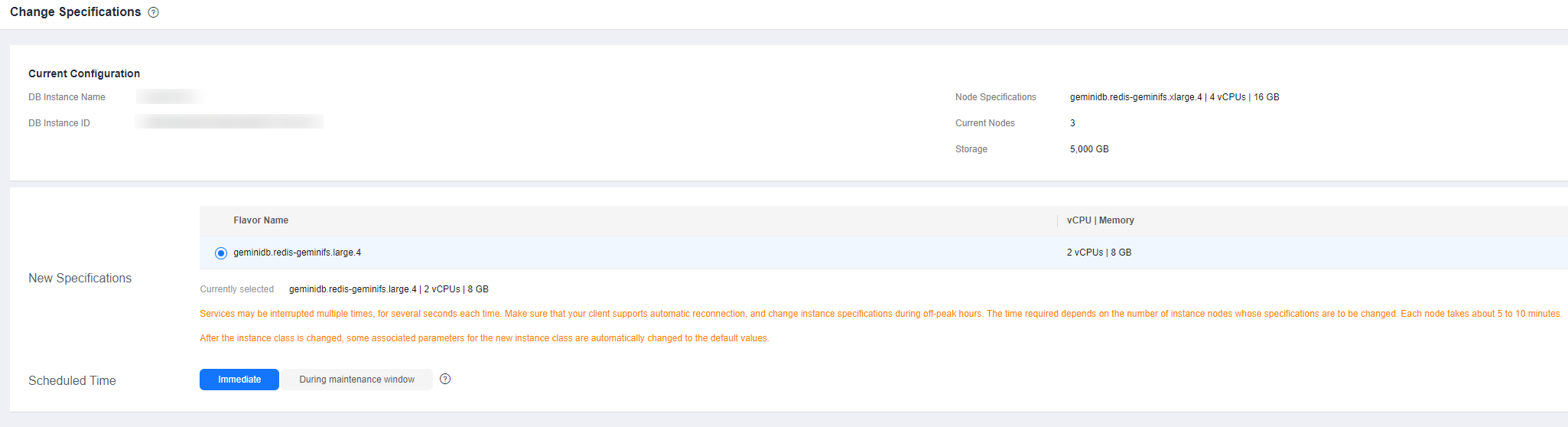 - During online specification change, second-level intermittent disconnection occurs once when the change is performed on a single node. Therefore, the entire instance is intermittently disconnected for several times. The client must have an automatic reconnection mechanism. You are advised to perform the specification change during off-peak hours.