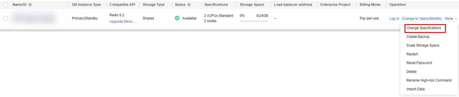 - Locate an instance with cloud native storage, Click Change Specifications in the Operation column.