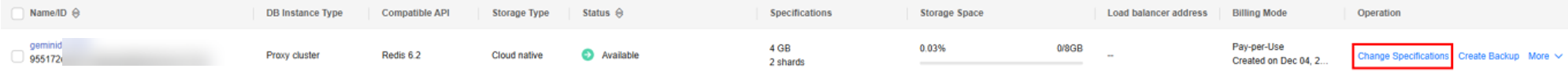- Second-level intermittent disconnection occurs once when the specifications are changed on a single node. Therefore, the entire instance is intermittently disconnected several times. Ensure that the client can be reconnected. You are advised to perform the specification change during off-peak hours.