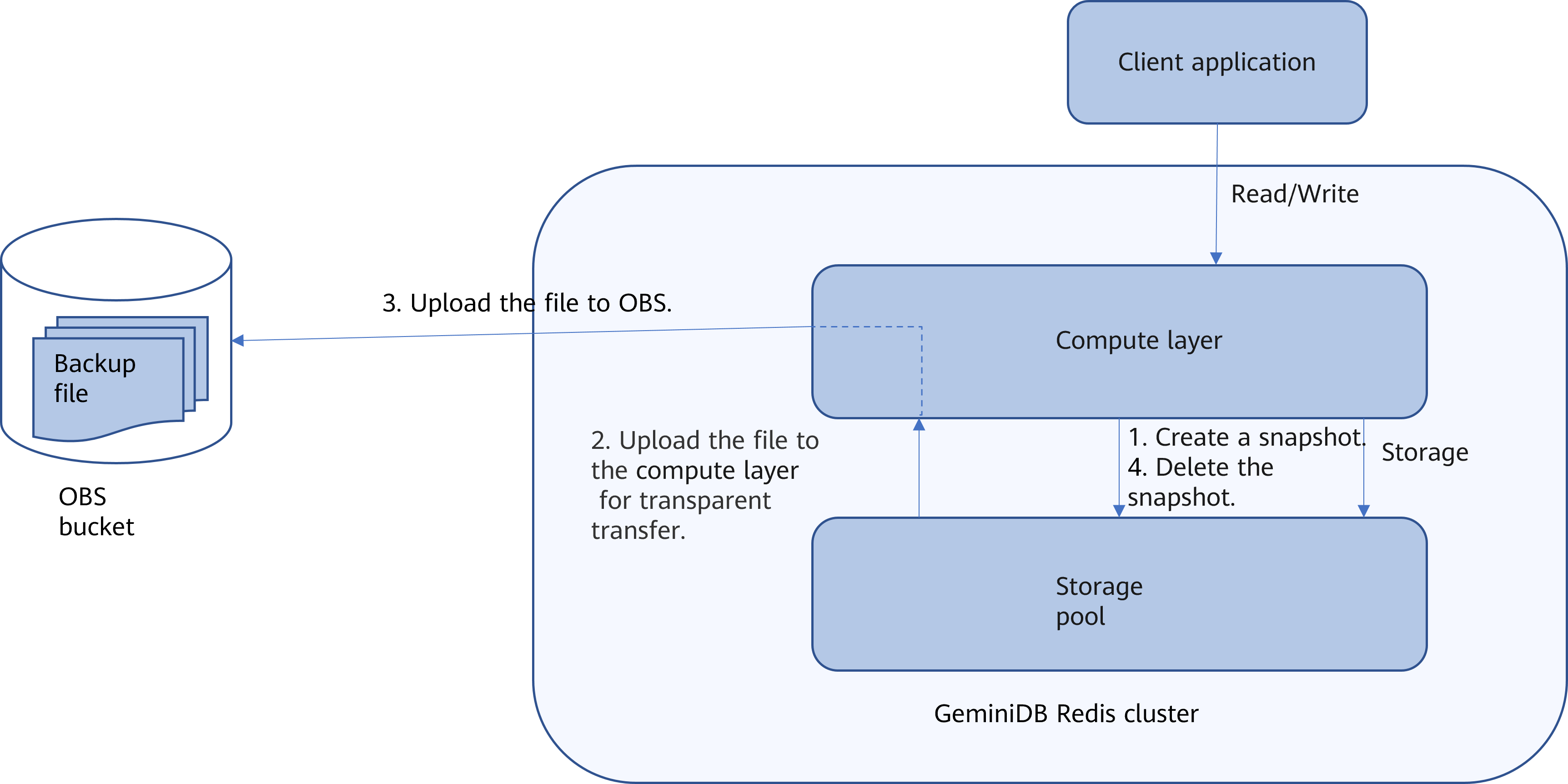 GeminiDB Redis API uses an architecture with decoupled storage and compute. Figure 1 shows how GeminiDB Redis API backs up data. GeminiDB Redis API takes snapshots of data in the storage pool in seconds and transmits them to the compute layer, which will then pass them to OBS. Snapshots are stored as compressed files in OBS buckets and do not occupy any storage space of your instance. Snapshot creation and deletion have no impacts on the computing layer. When snapshots are uploaded, some compute resources are consumed, so the instance CPU and memory usage may go high.
