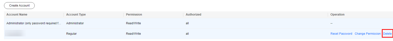- On the displayed page, locate the account that you want to delete and click Delete. In the displayed dialog box, click OK.