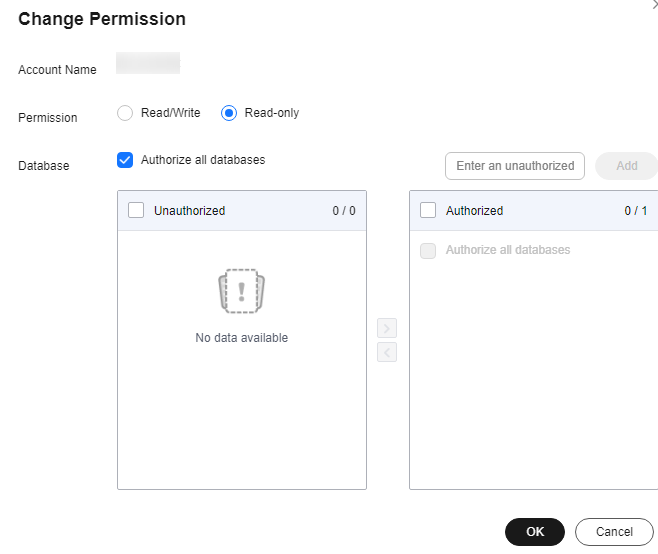 - In the displayed dialog box, select the required permissions and database, and click OK.