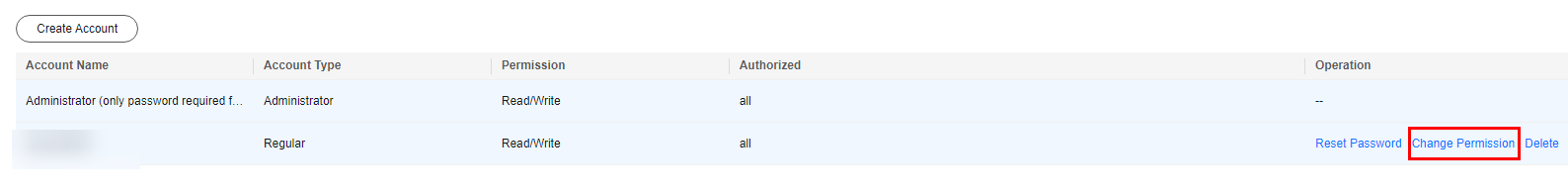 - On the displayed page, select the account whose permissions need to be modified and click Change Permission.