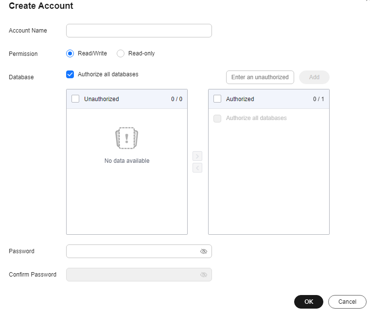- In the displayed dialog box, enter a username, select permissions for databases, authorize required databases (DBs), enter a password, confirm the password, and click OK.