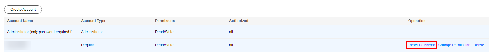 - On the displayed page, select the account whose password needs to be reset and click Reset Password.