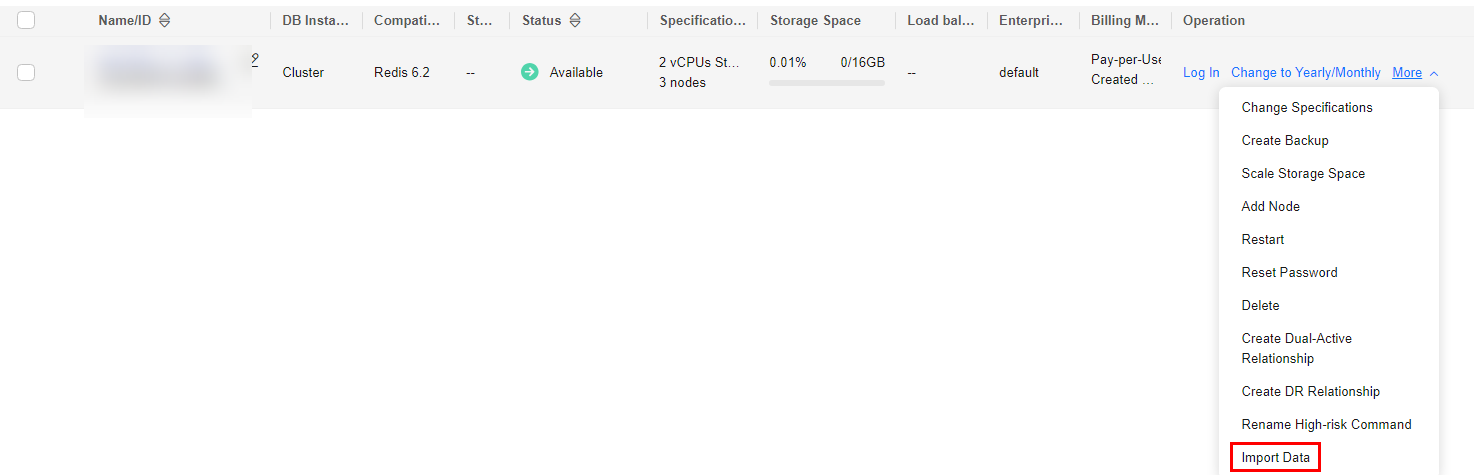 2. On the Instances page, locate the target instance and choose More > Import Data in the Operation column.
