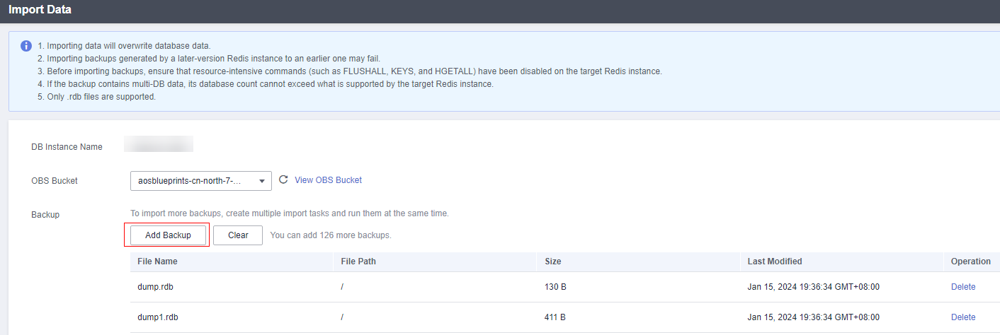 • If a backup contains multi-DB data, its database count cannot exceed what is supported by the target Redis instance.