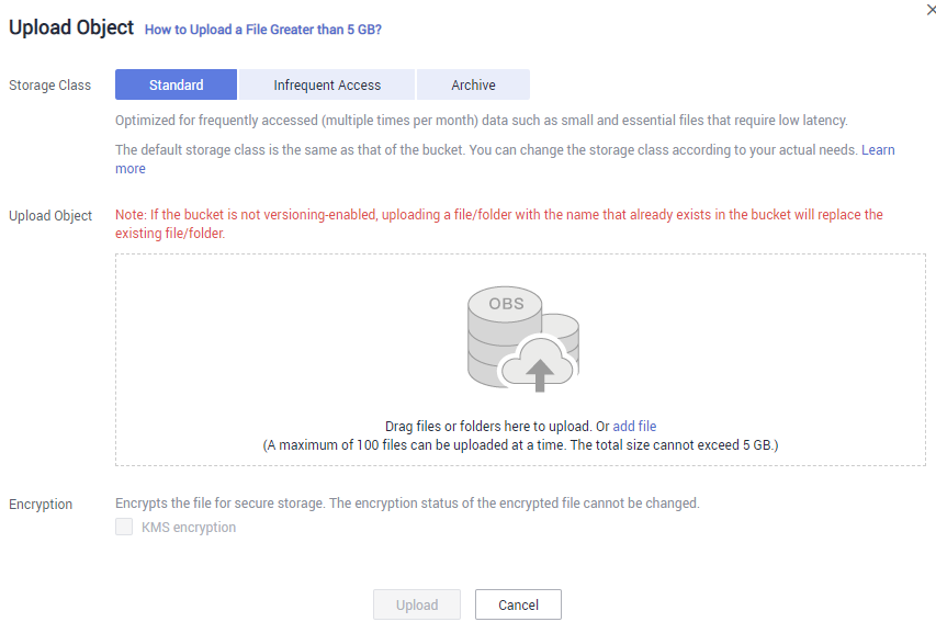 If the backup to be uploaded is larger than 5 GB, follow the instructions provided by OBS.