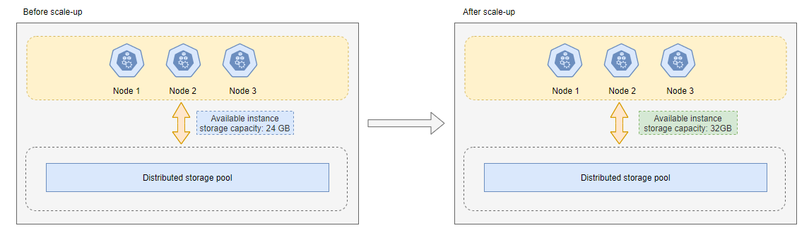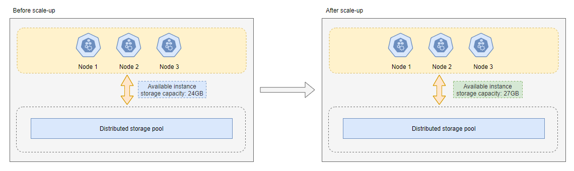 For example, if the classic storage space is 24 GB before scale-up, the storage usage threshold for triggering autoscaling is set to 80%, and the total storage needs to be automatically scaled up by 10%. For example, if the storage usage is greater than or equal to 80%, the storage space is automatically scaled up by 2.4 GB (24 x 10%), which is rounded up to 3 GB. In this case, the total storage space becomes 27 GB (24 + 3).