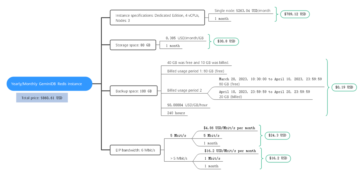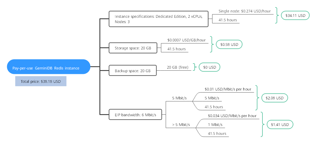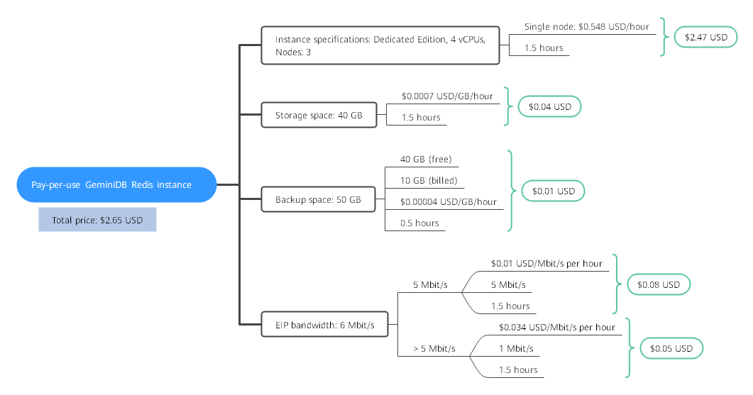 The total price of this GeminiDB Redis instance involves both pay-per-use and yearly/monthly usage: