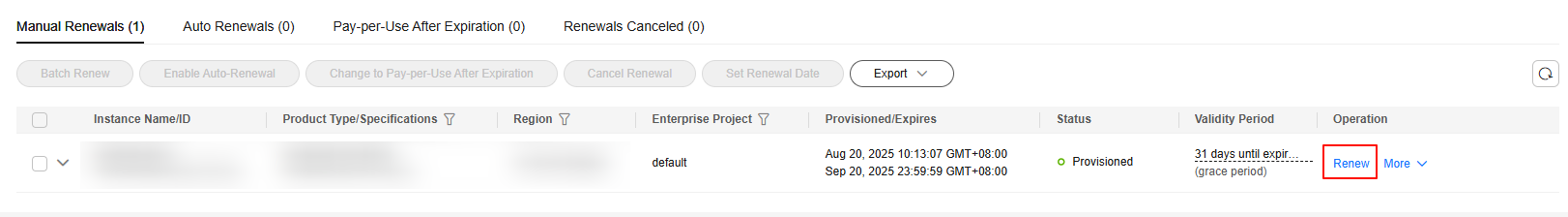 - Individual renewal: Locate an instance that you want to renew and click Renew in the Operation column.