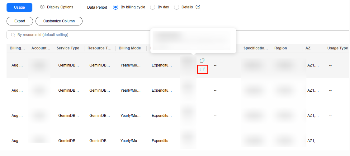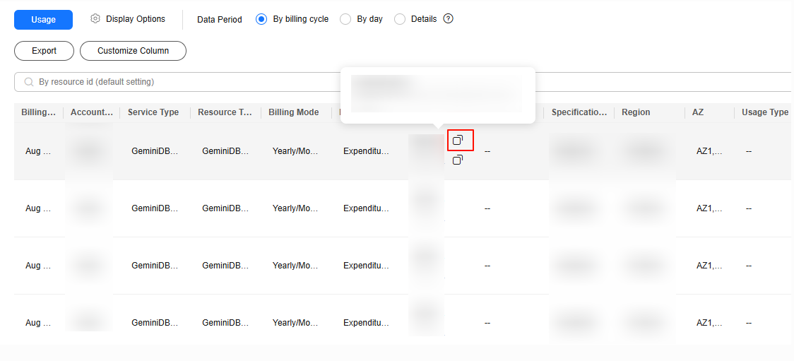 - In the navigation pane, choose Billing > Expenditure Details. Click the icon shown in the following figure to copy the resource ID.