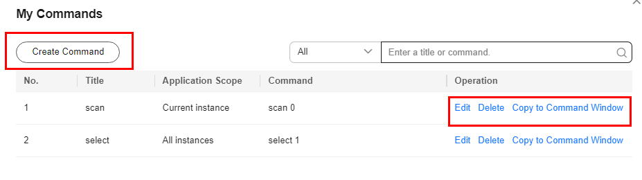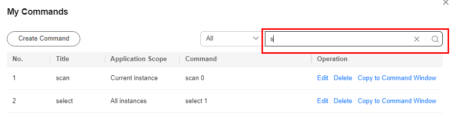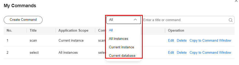 Set a filter to narrow the scope of commands. If you select All, all commands saved in the current account are displayed.
