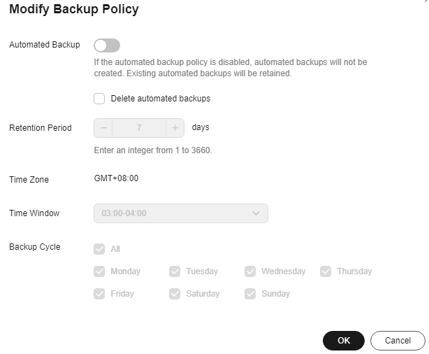 When disabling the automated backup policy, you can decide whether to delete the automated backups by selecting Delete automated backups.- If you select it, all backup files within the retention period will be deleted. No automated backups are displayed in the backup list until you enable the automated backup policy again.