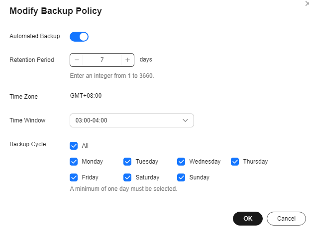 - Time Window: A one-hour period the backup will be scheduled for, such as 04:00–05:00. The backup time is in GMT format. If the DST or standard time is switched, the backup time segment changes with the time zone.