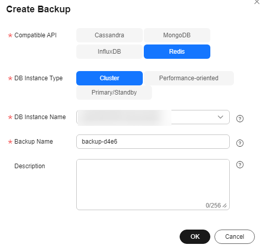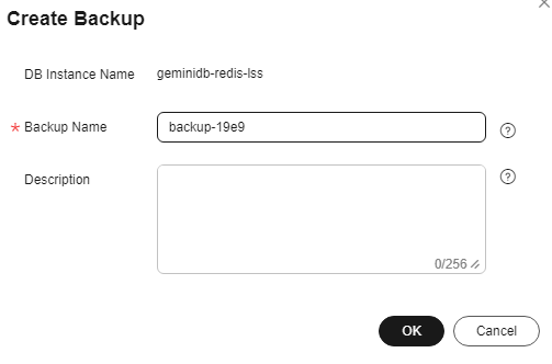- In the displayed dialog box, specify a backup name and description and click OK.