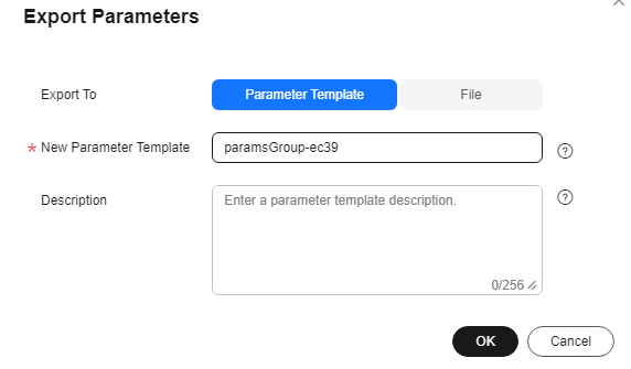 • Parameter Template Name: The template name can include 1 to 64 characters. It can contain only uppercase letters, lowercase letters, digits, hyphens (-), underscores (_), and periods (.).