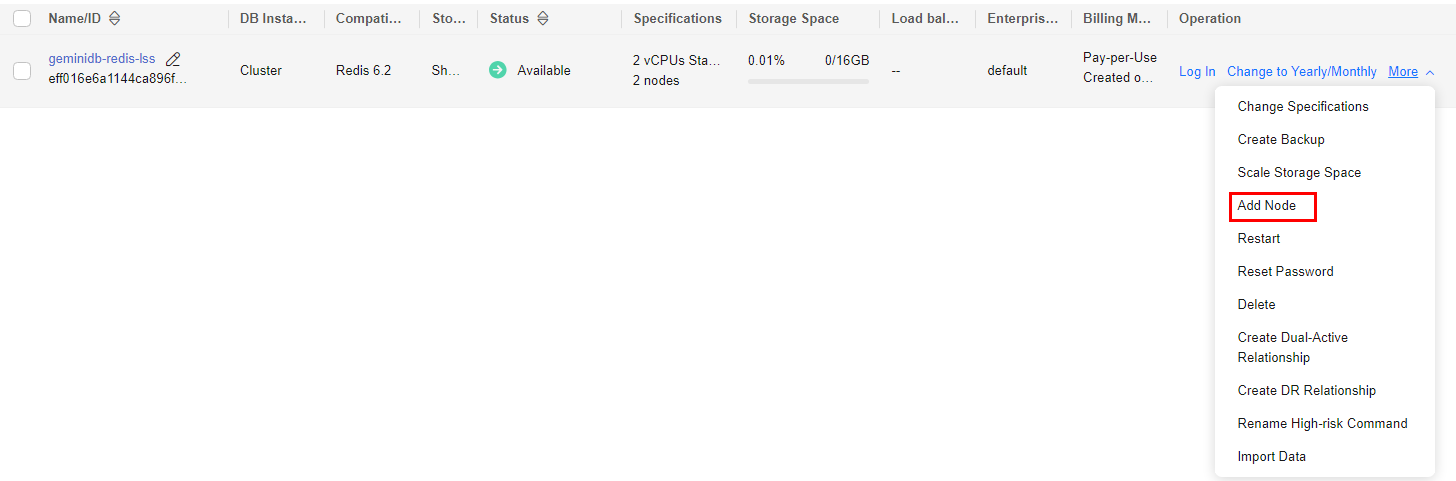 - If the storage is insufficient, adding nodes is not supported. Expand the storage first. For details about the storage supported by instances of different specifications, see Instance Specifications.