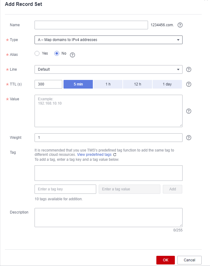 For details about how to configure parameters, see Adding Record Sets for a Public Zone.