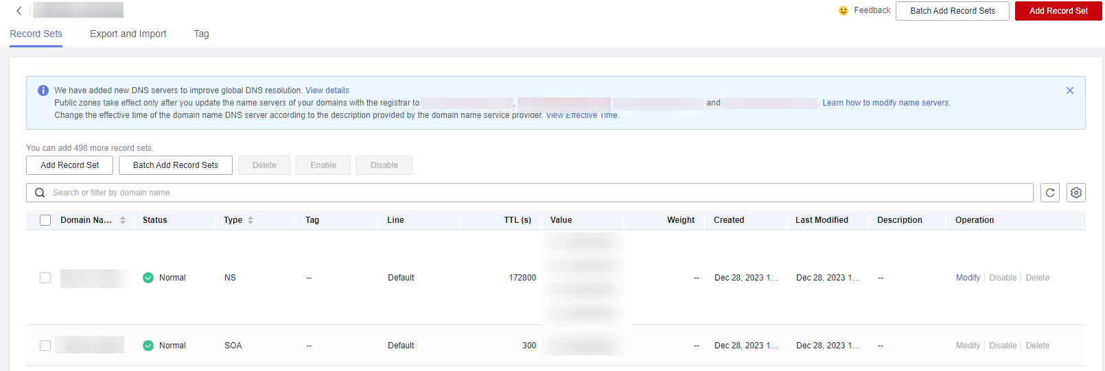 - Click the name of the public domain name you created. On the displayed page, click Add Record Set in the upper right corner.